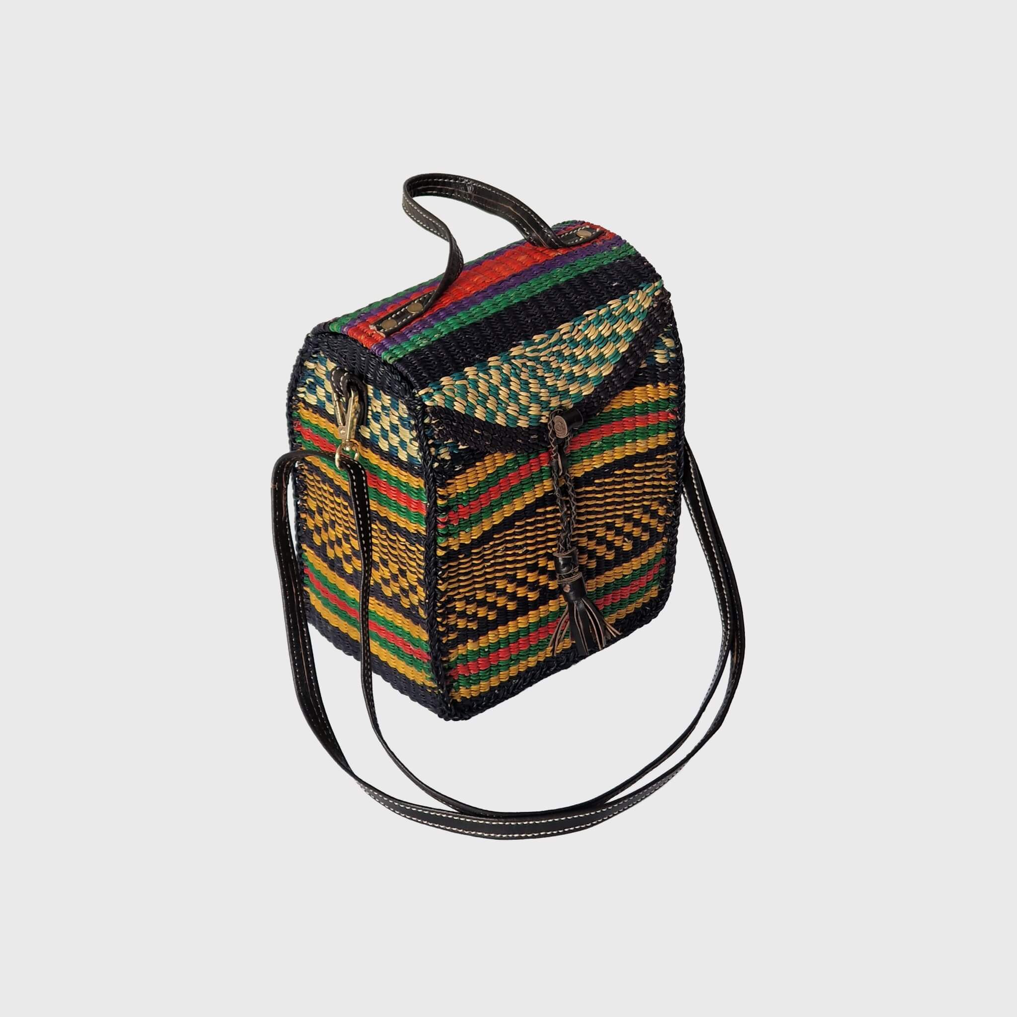 Discover a truly unique and versatile accessory with our Boxed Bag, meticulously handwoven from durable elephant grass by talented women in Northern Ghana. This distinctive bag features a strong, structured box-like shape, making it stand out from traditional basket bags. It's thoughtfully designed with a practical top handle, a secure flap closure with a simple loop, and versatile long straps that allow it to be worn on the side or as a mini-backpack.