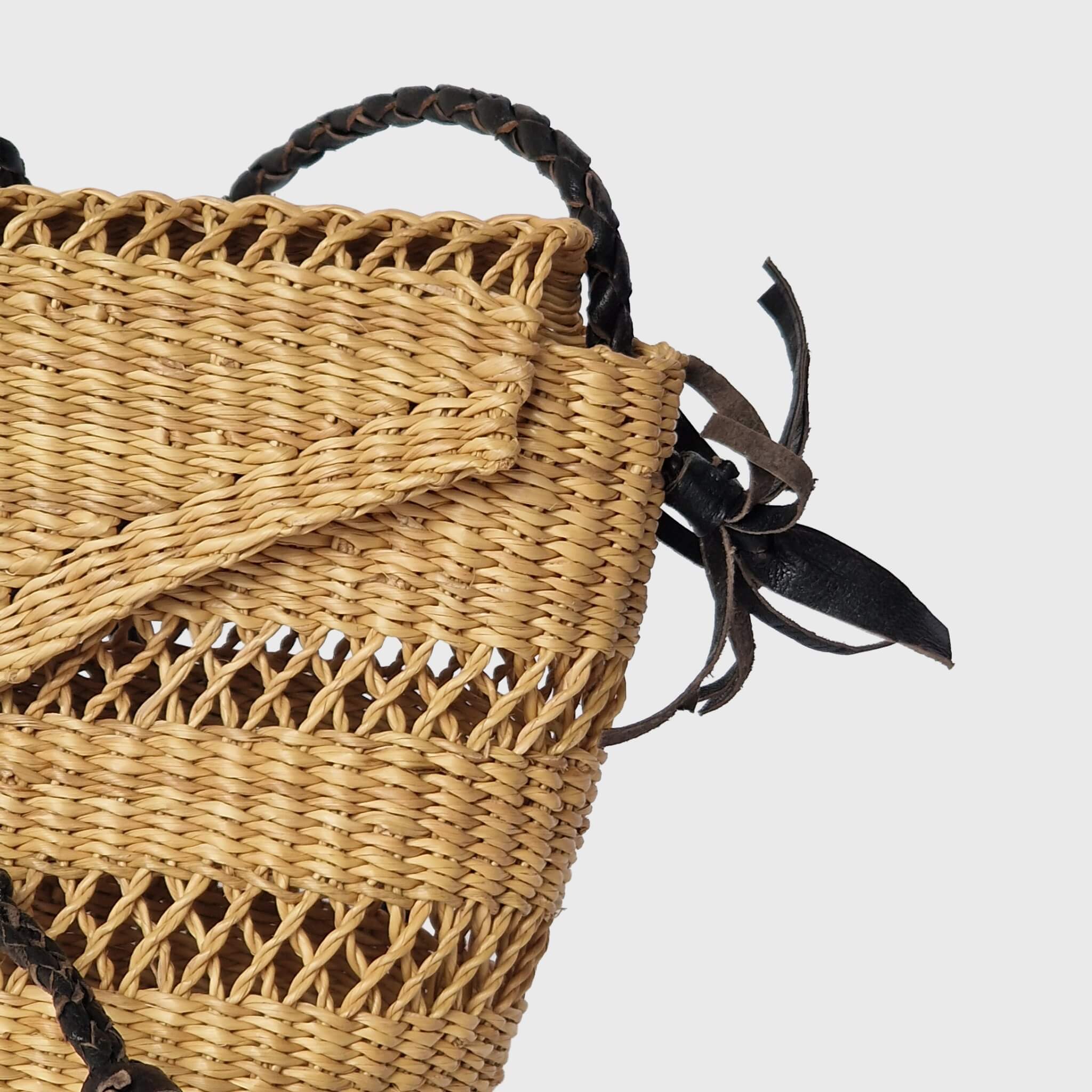 Introducing our Small Handbag, a charming and unique accessory meticulously handwoven from durable elephant grass by talented women in Northern Ghana. This compact bag offers a distinctly different style, featuring a neat flap closure with a simple loop, and a long, slender strap designed for comfortable wear across the body or over the shoulder.