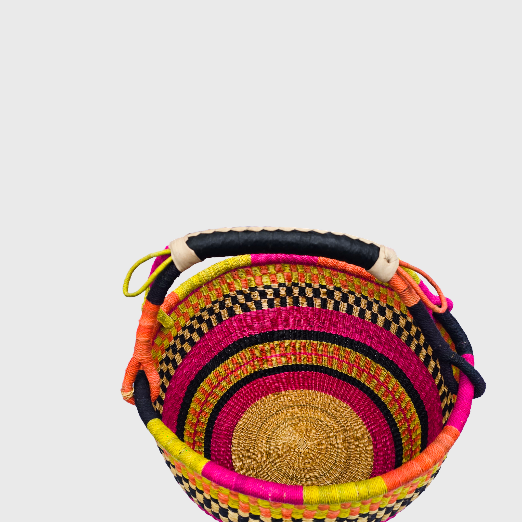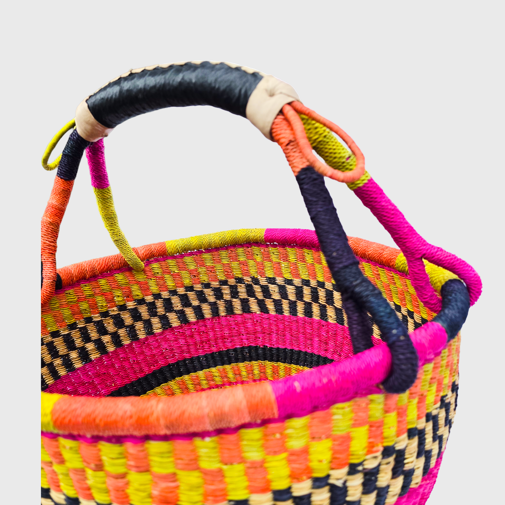 Each Bolga Basket is a unique piece of art, showcasing the precise, tight weaving patterns and the vibrant colours (or natural tones, like the one pictured) that reflect the creativity of our artisans. Made from sustainably sourced elephant grass, these baskets offer an eco-friendly way to enhance your life. The distinctive firm handle and robust structure highlight the exceptional skill of its maker, bringing a truly special handcrafted item into your daily routine.