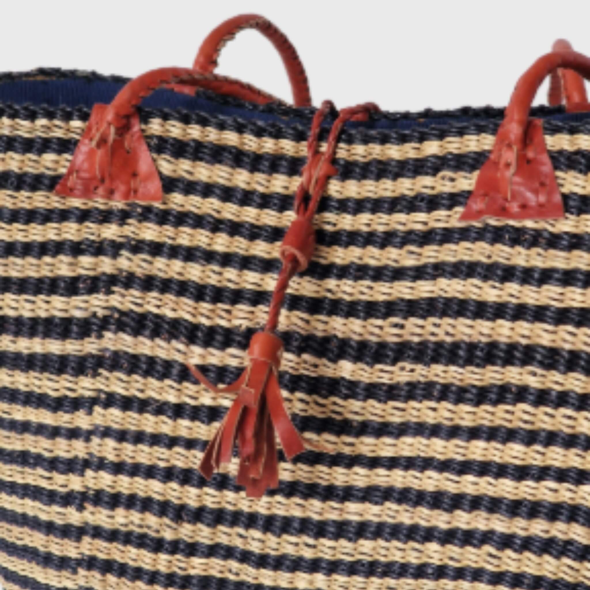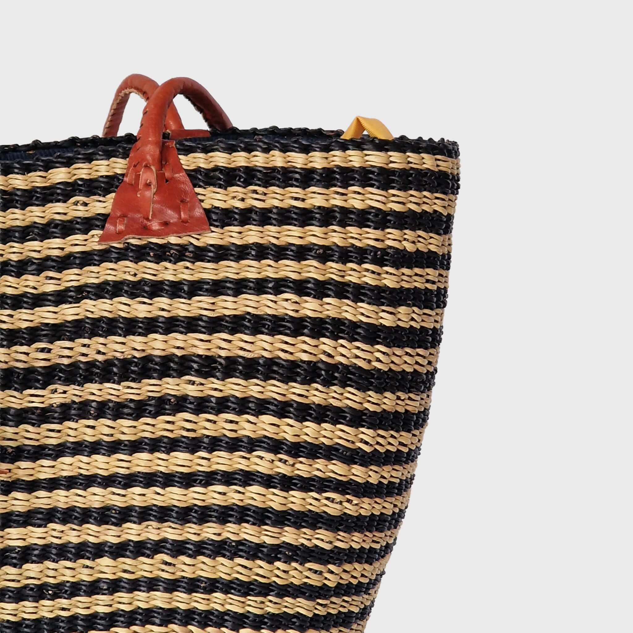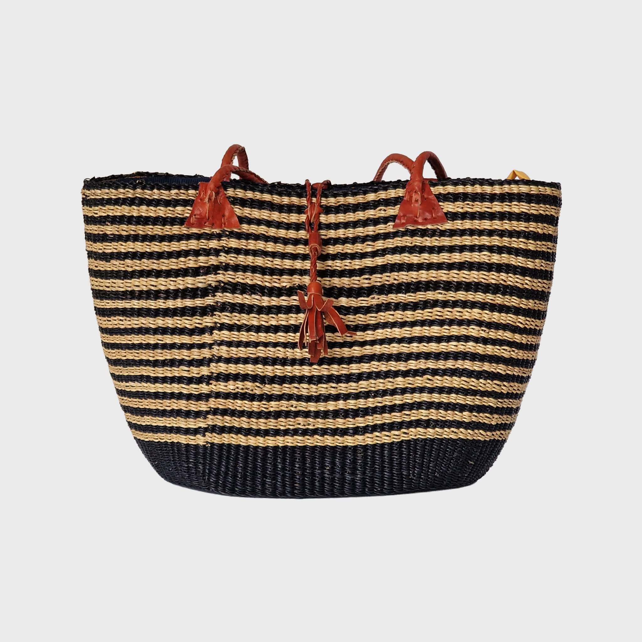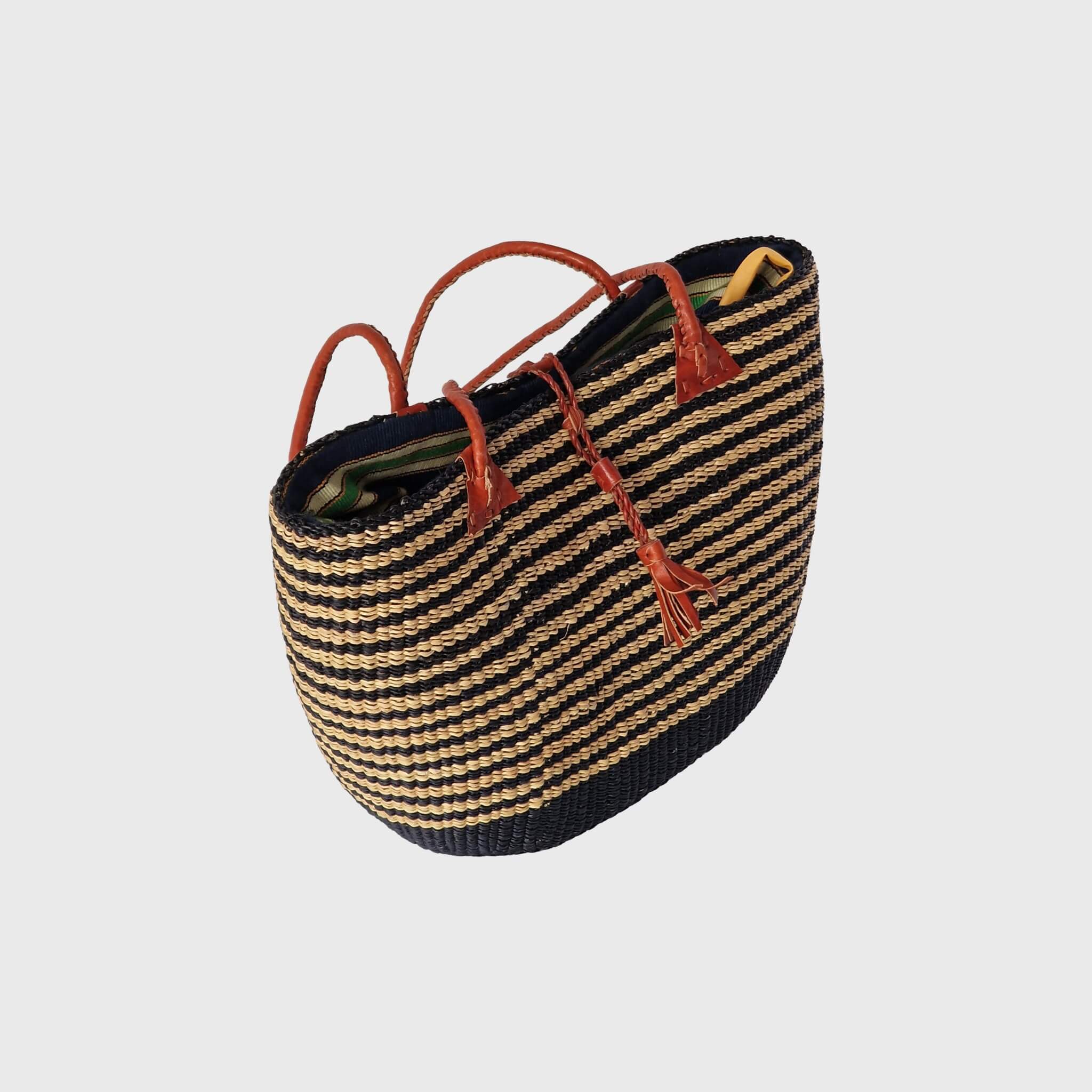 Each Oval Base Drawstring Bag is a unique piece of art, showcasing the intricate, tight weaving patterns and the vibrant colours (or natural tones, like the one pictured) that reflect the creativity of our artisans. Made from sustainably sourced elephant grass, these bags are not only strong and durable but also eco-friendly. The distinctive rounded-corner rectangular base, combined with its longer, comfortable handles and its convenient fabric lining with a drawstring closure, offers a perfect blend of modern aesthetics and traditional Ghanaian craftsmanship.