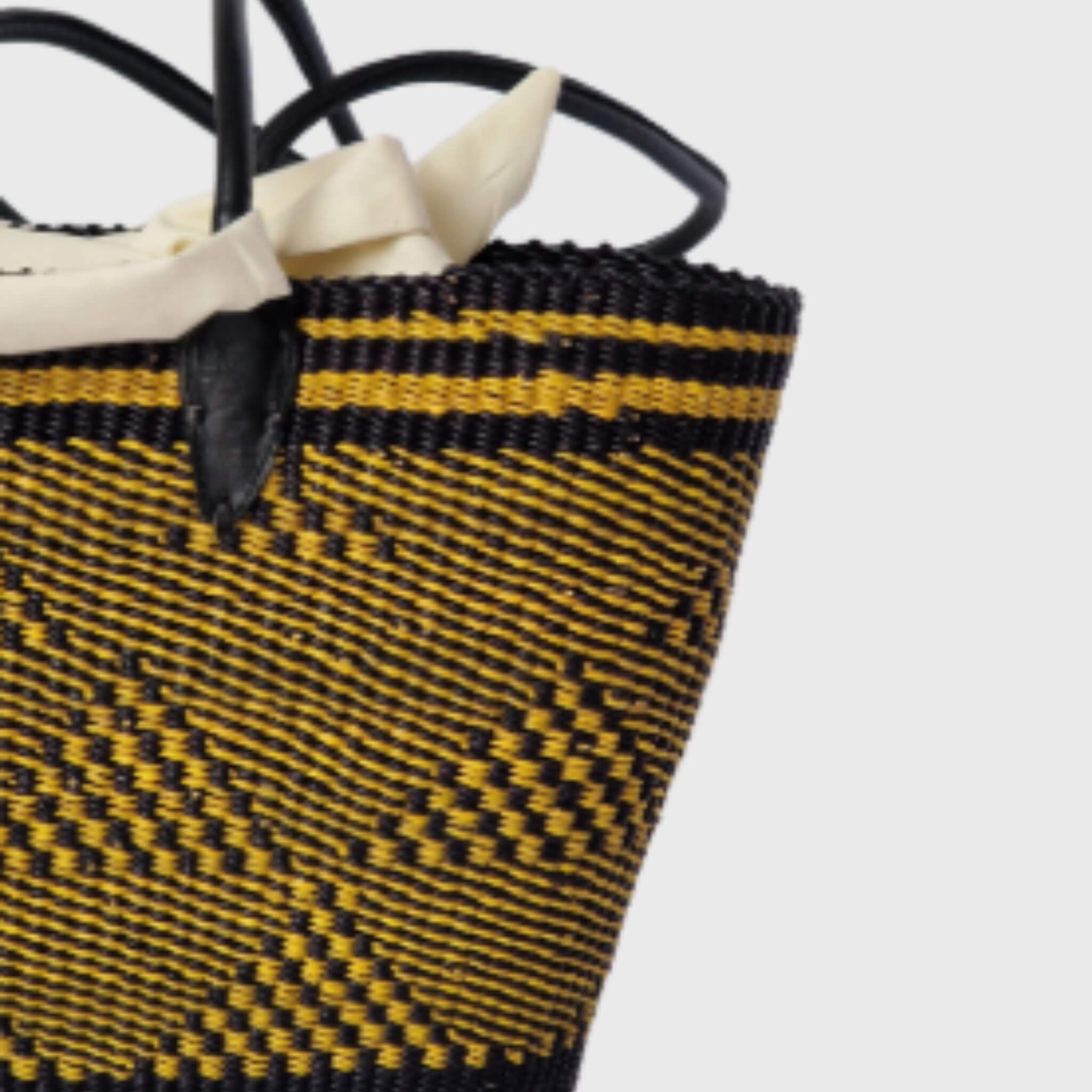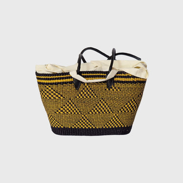 Each Tie Fabric Bag is a unique piece of art, showcasing the intricate, tight weaving patterns and the vibrant colours (or natural tones, like the one pictured) that reflect the creativity of our artisans. Made from sustainably sourced elephant grass, these bags are not only strong and durable but also eco-friendly. The distinctive rounded-corner rectangular base, combined with its comfortable handles and its unique fabric lining with a charming tie closure, offers a perfect blend of modern aesthetics and traditional Ghanaian craftsmanship.